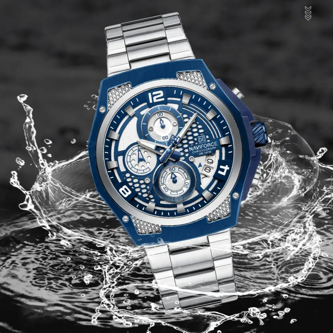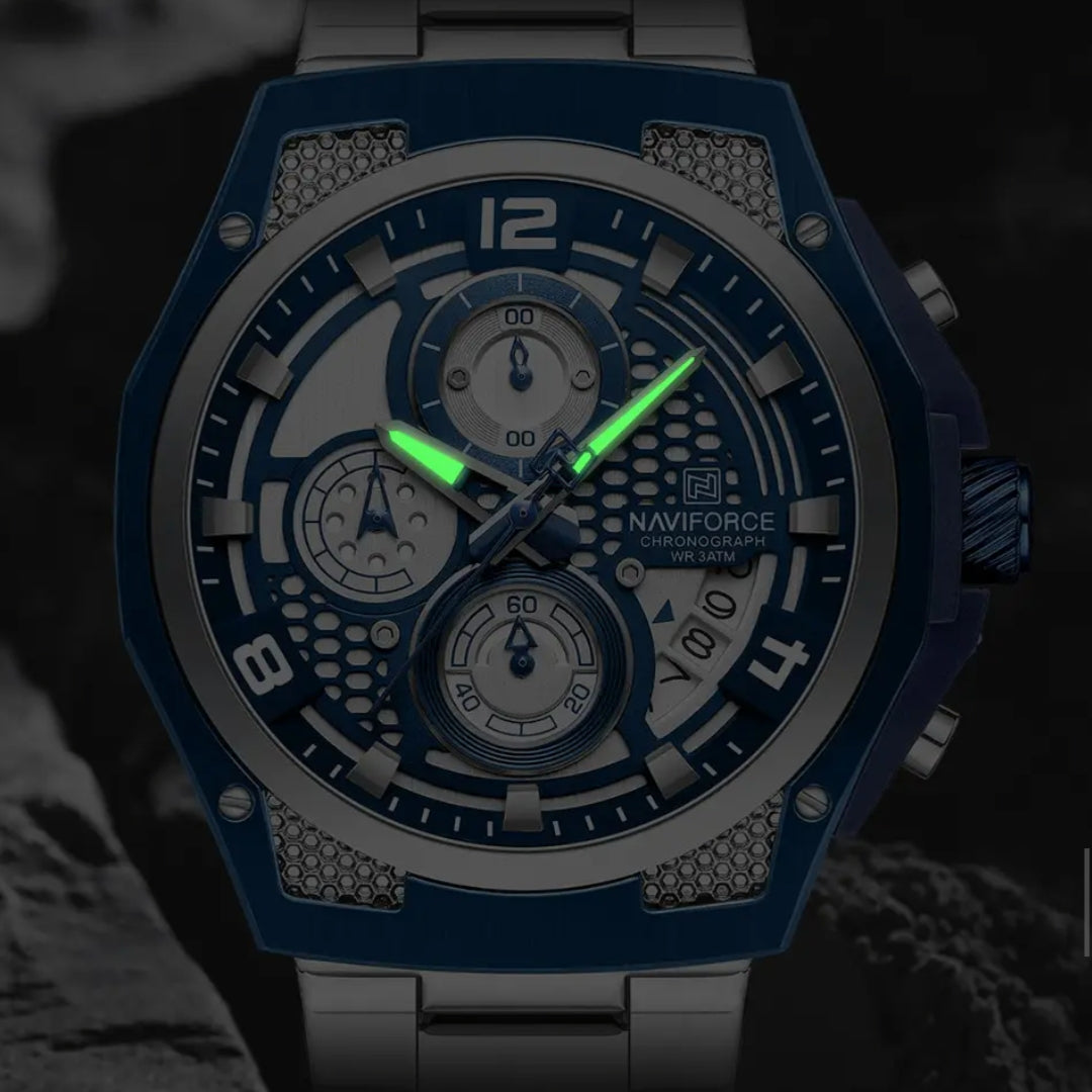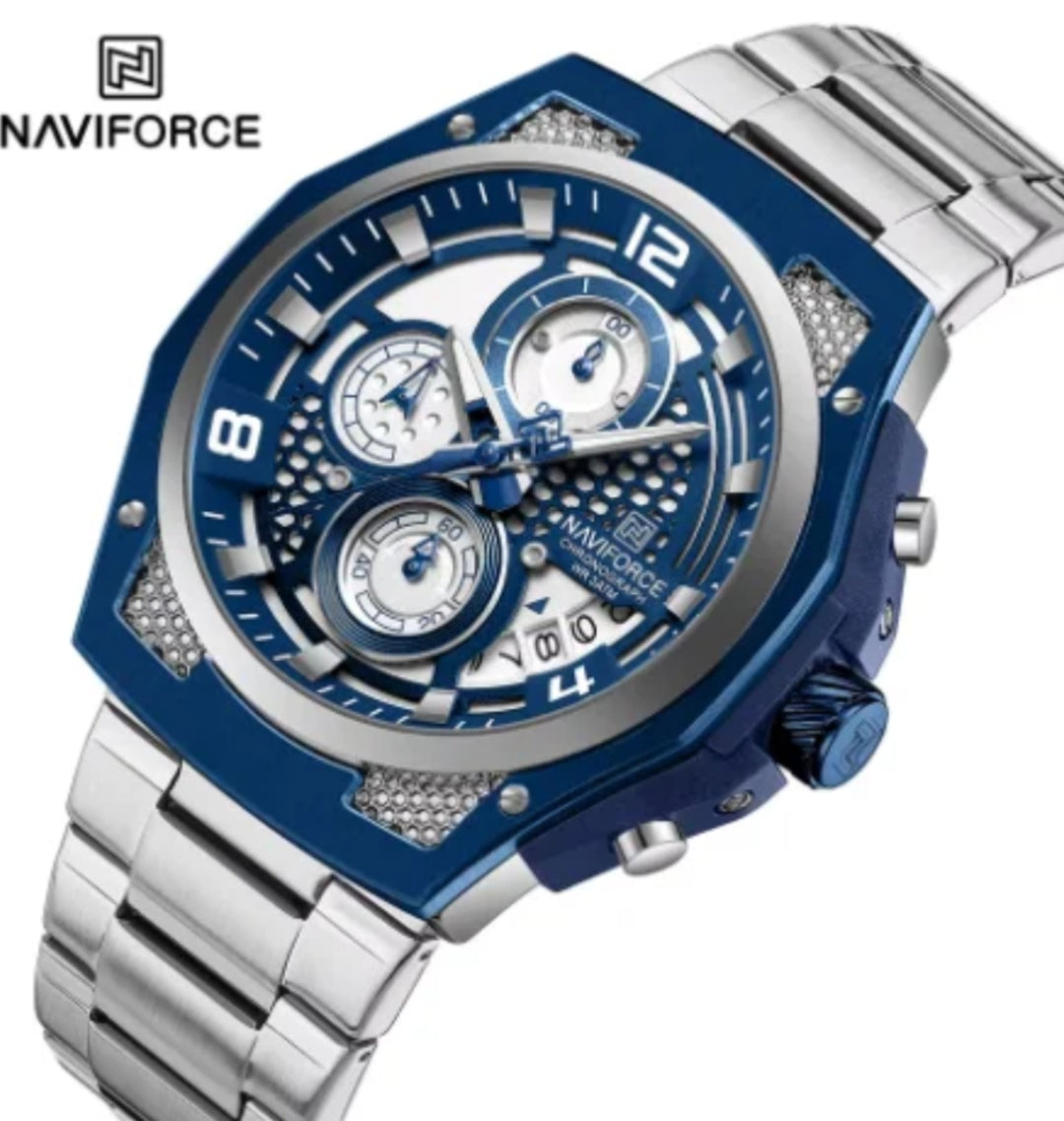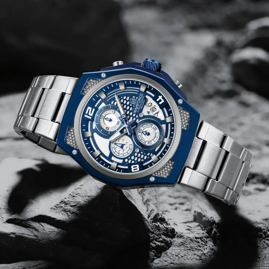 Cette montre est le modèle Naviforce NF8051S, une montre pour homme au design "honeycomb" (nid d'abeille) qui allie un style sportif et rétro.