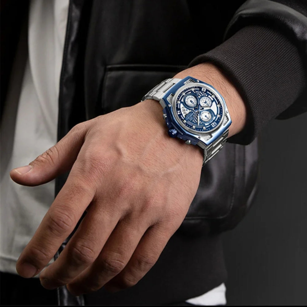 Fonctions : Elle dispose de trois sous-cadrans fonctionnels (chronographe), d'un affichage de la date et d'aiguilles lumineuses pour la vision nocturne.
